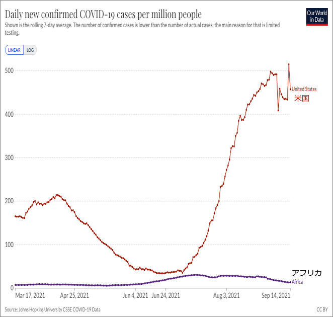 (※) さて、そのワクチン接種率の低いアフリカの感染の状況は……。アメリカと比べてみました。人口100万人あたりの感染確認数の推移です。