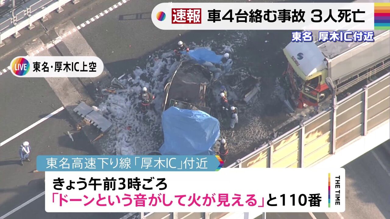 10日未明、神奈川県厚木市の東名高速道路で、トラックなど4台が関係する事故があり、消防によりますと、3人が死亡したということです。警察が事故の詳しい状況を調べています。