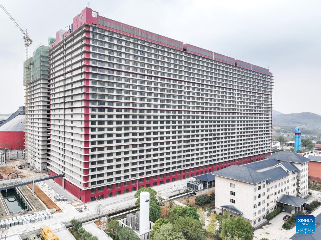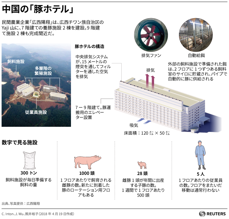 中国湖北省鄂州(がくしゅう)市の郊外に、巨大なマンションのような建物がそびえ立っている。26階建てのこの建物は、オフィスビルでも家族向けマンションでもない。年間120万頭の豚を処理することができる養豚施設だ。単一の建物としては世界最大の養豚施設となっている。