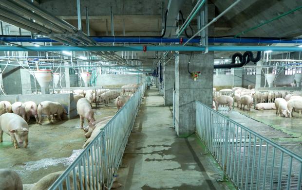 鄂州市のこの施設は10月、3700頭の種豚たちとともに操業を開始した。その隣には、同じ外観と規模を持つもう一つの豚舎が完成間近となっている。施設内の温度や空調はコントロールされており、ボタンひとつで3万以上ある自動給餌スポットから豚たちに餌をやることができる。
