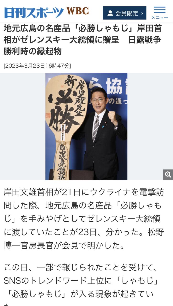 岸田首相がゼレンスキー大統領に「必勝しゃもじ」贈呈 地元広島の名産品 [えりにゃん★]