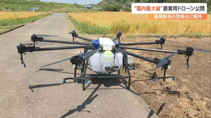 国内最大級の農業用ドローンが10日、大分市で公開されました。農薬を入れるタンクの大きさは通常の7倍で散布の効率化が期待されます。