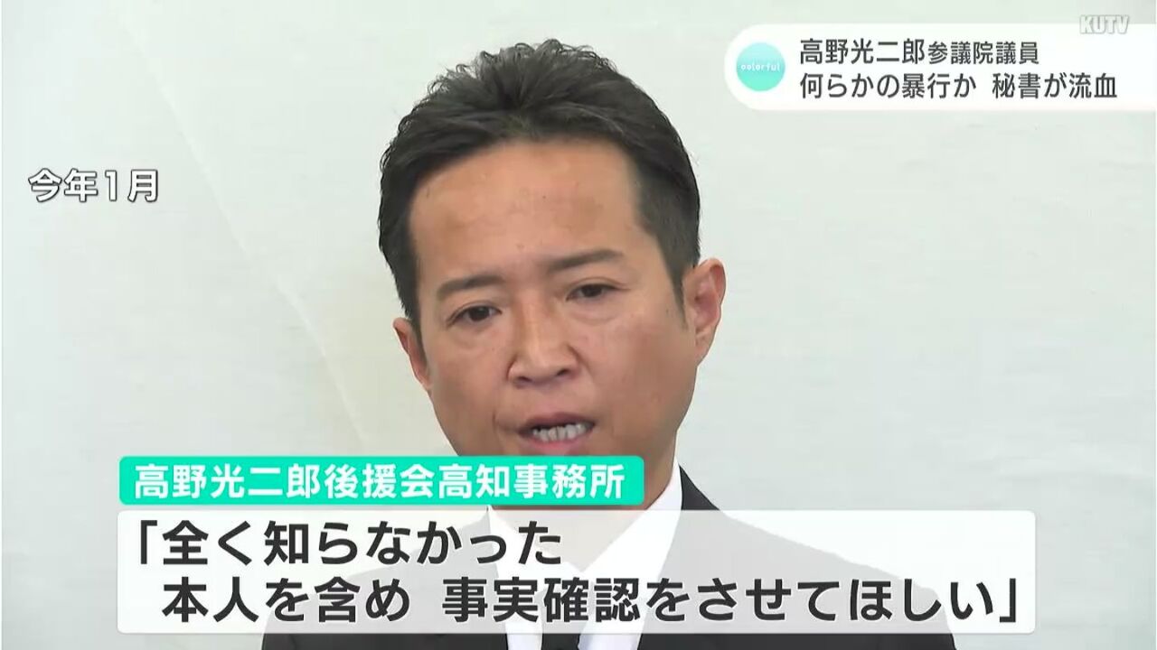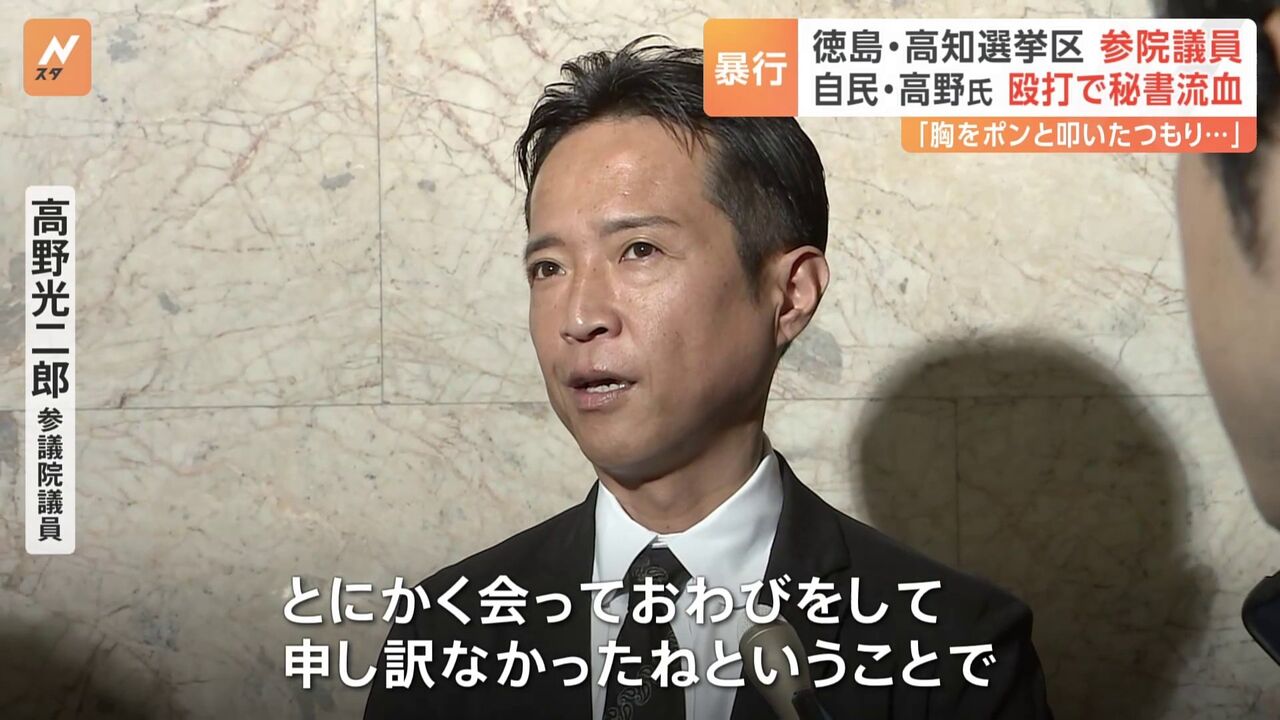 自民党の高野光二郎参院議員は14日、国会内で記者団の取材に応じ、昨年末に当時秘書だった20代男性を殴打し、鼻血を出させたと明らかにした。「飲み会で気合を入れるつもりで胸の辺りをたたくつもりが、鼻に当たった」と語った。