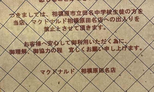 「店内での中学生迷惑行為に関して、他のお客さまへのご迷惑、店舗スタッフの身に危険を感じることがございます。つきましては、〇〇市立〇〇中学校生徒の方を、当店、マクドナルド〇〇店への出入りを禁止とさせて頂きます」(いずれも貼り紙では実名)
