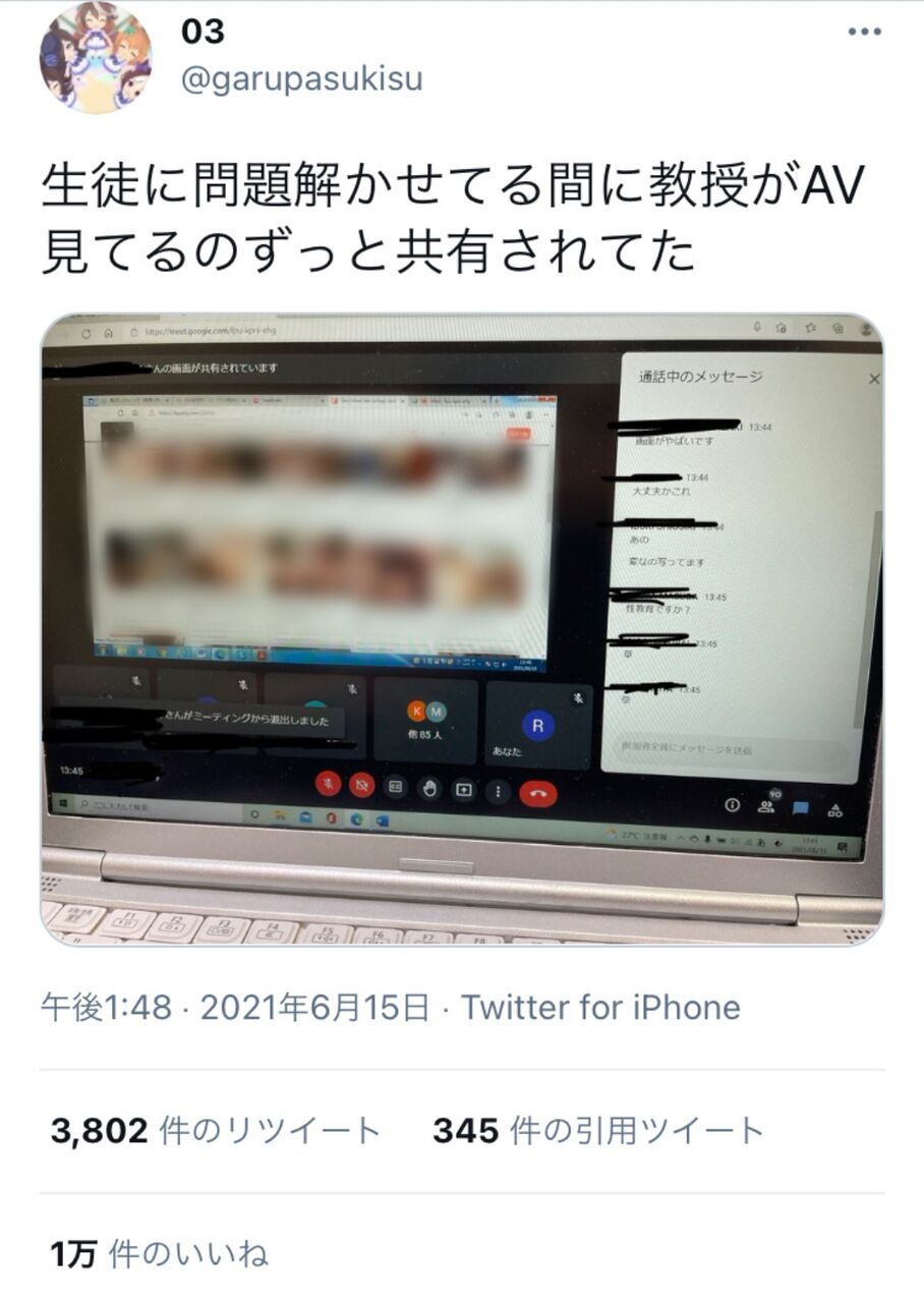 学生から提供された画面の録画映像を確認すると、実際にアダルト動画も再生されていた。出席者のメッセージ欄には「画面がやばいです」「大丈夫かこれ」との指摘が相次いでおり、複数人が退出していた。